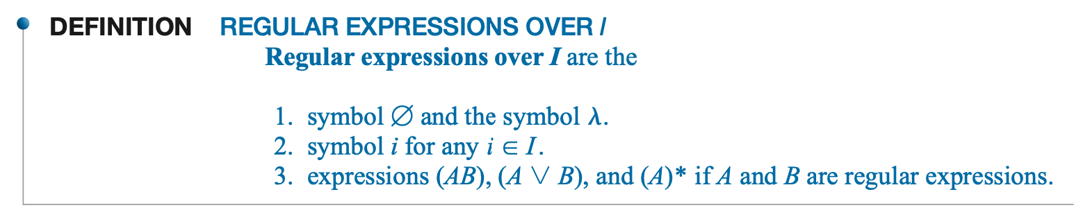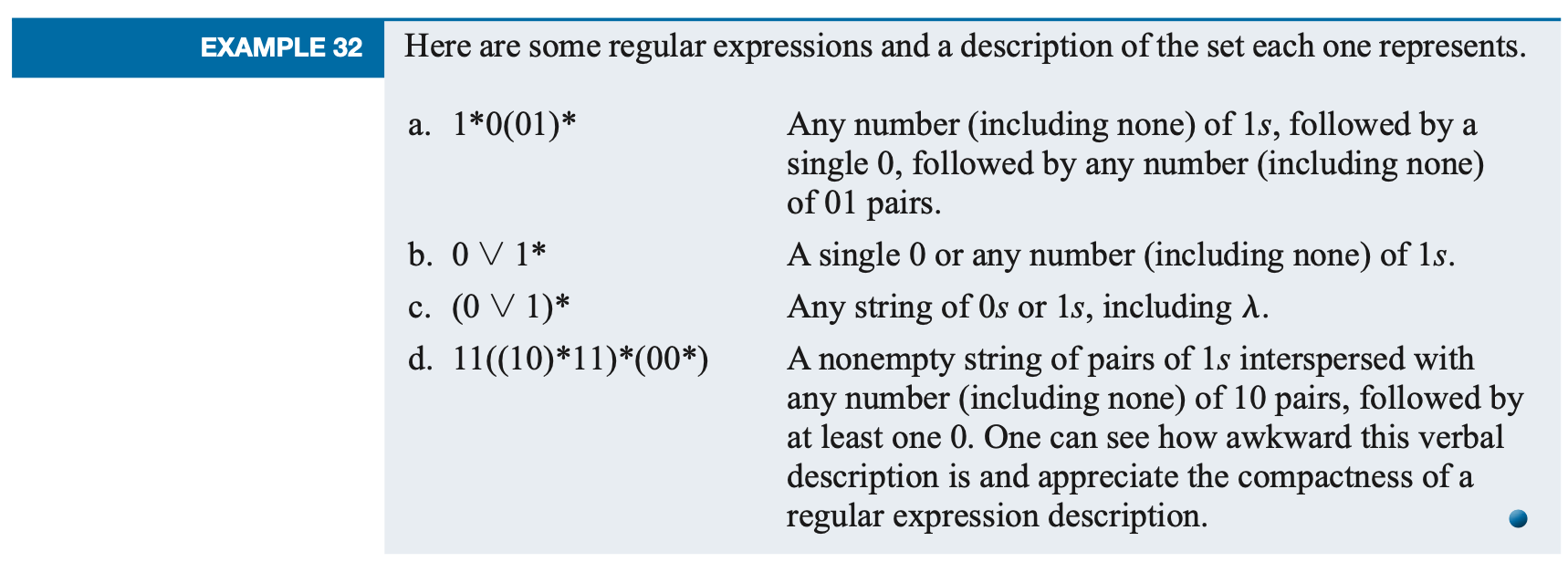 We want a compact, symbolic way to describe sets such as those appearing in the answer to Practice 49. We will describe such sets by using regular expressions ; each regular expression describes a particular set.(Regular expressions, often abbreviated as regex or regexp, are sequences of characters that define a search pattern. They are used in various programming languages and text-processing tools to find and manipulate strings of text based on specific patterns. Regular expressions are a powerful tool for text processing and manipulation, but they can also be complex and difficult to understand at first. However, once you become familiar with their syntax and usage, they can greatly simplify many text-processing tasks.)
