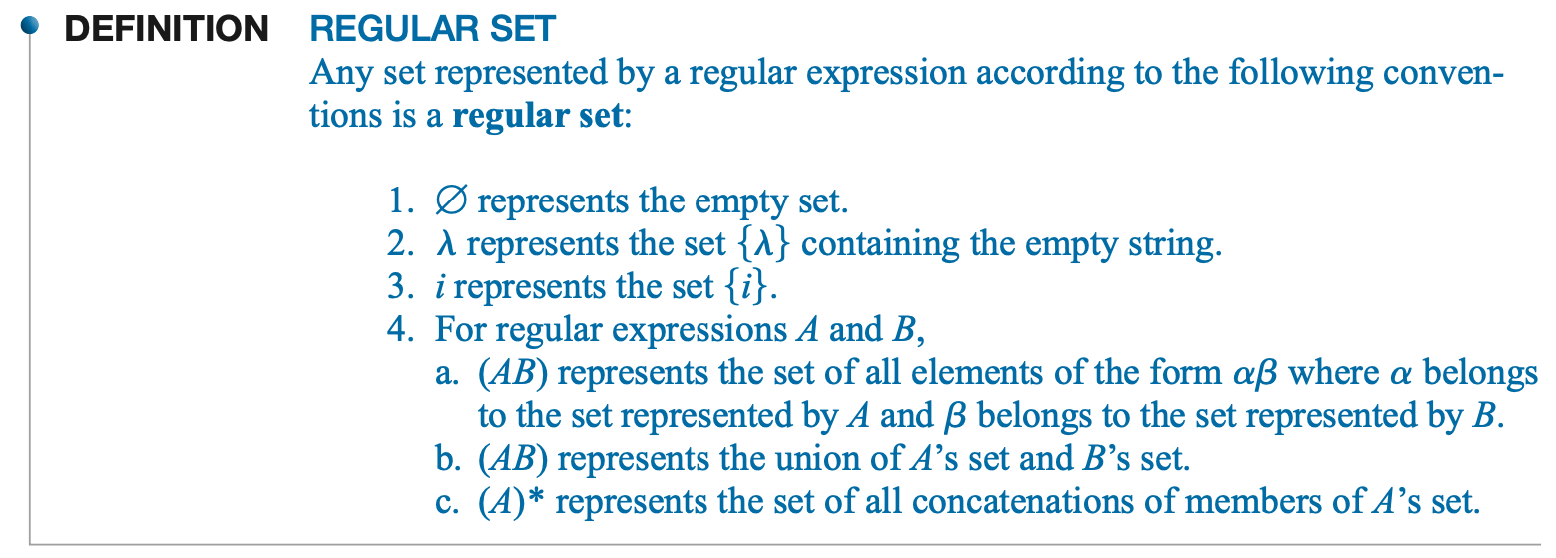 We have introduced regular sets because, as it turns out, these are exactly the sets finite-state machines are capable of recognizing. This result was first proved by the American mathematician Stephen Kleene in 1956. We state his theorem here without proof.