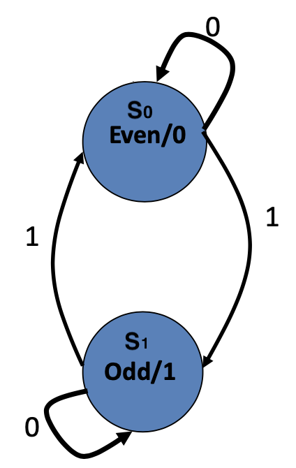 Redesign the odd parity checker FSM to make it check for even parity (that is, assert the output when the input contains an even number of 1's). Show your state table and state graph:
