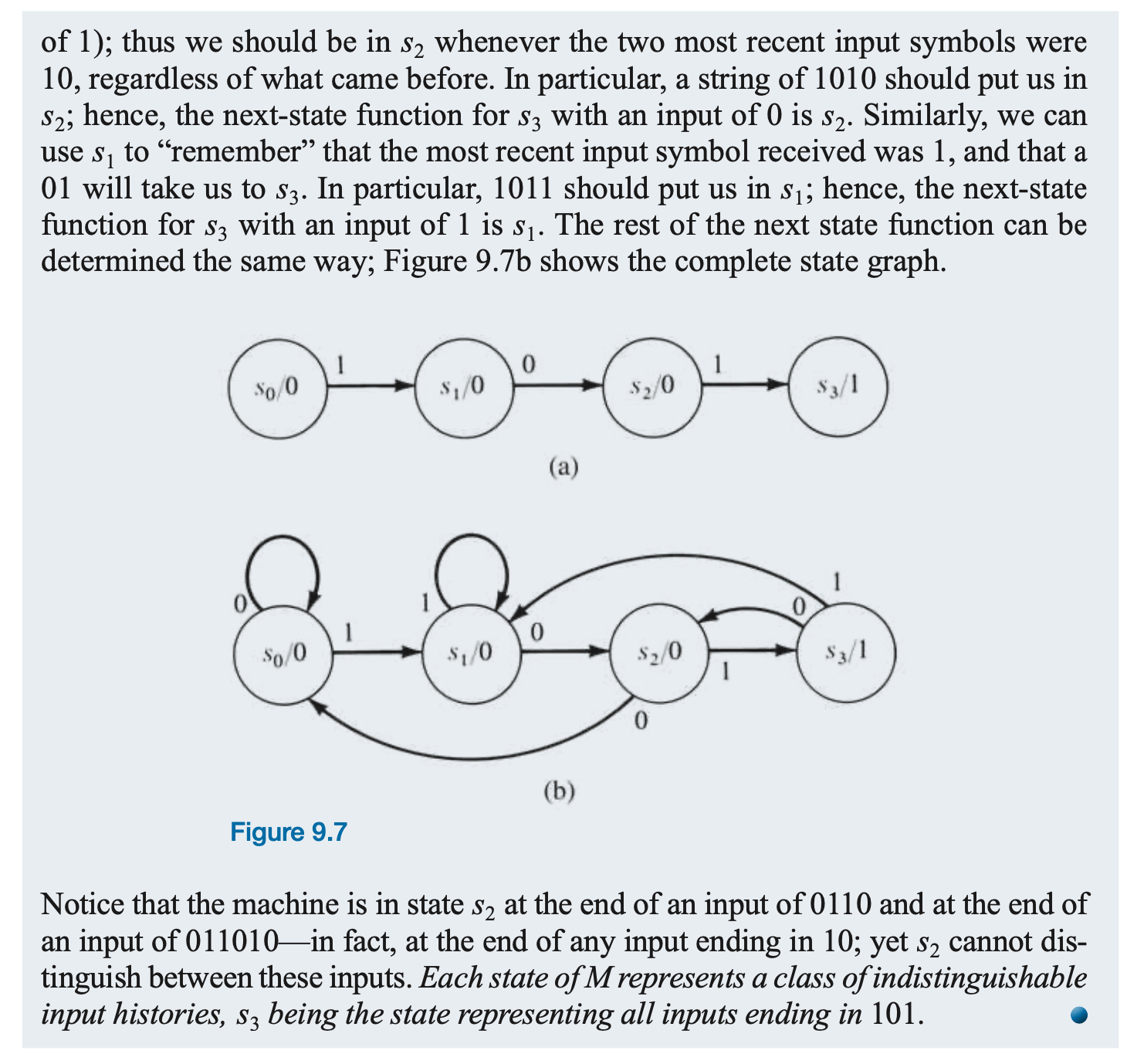 - ☆ The example 100101 shows that at state \(s_2\), if the input is 0, we should move back to \(s_0\). Since seeing another 0 after 10 means the pattern "101" has been broken, the machine must reset and start looking for a new potential match from the beginning.